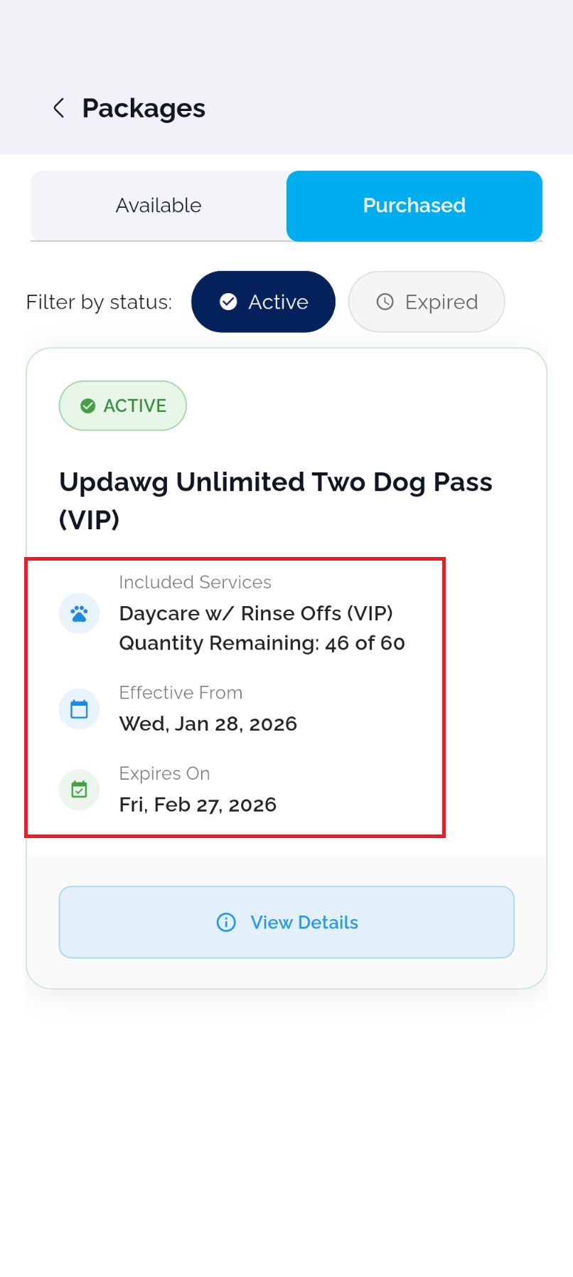 Result: You can view your active and expired passes here. This will show number of credits remaining and pass expiration.